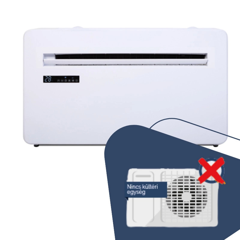 Innovatív monoblokk klímaberendezés kültéri egység nélkül, amely tökéletes megoldás műemléki és szabályozott homlokzatú épületekhez. A környezetbarát R290 hűtőközeggel működő, 3.5 kW teljesítményű DC inverteres rendszer hűt, fűt és párátlanít, miközben csak két diszkrét szellőzőnyílást igényel.