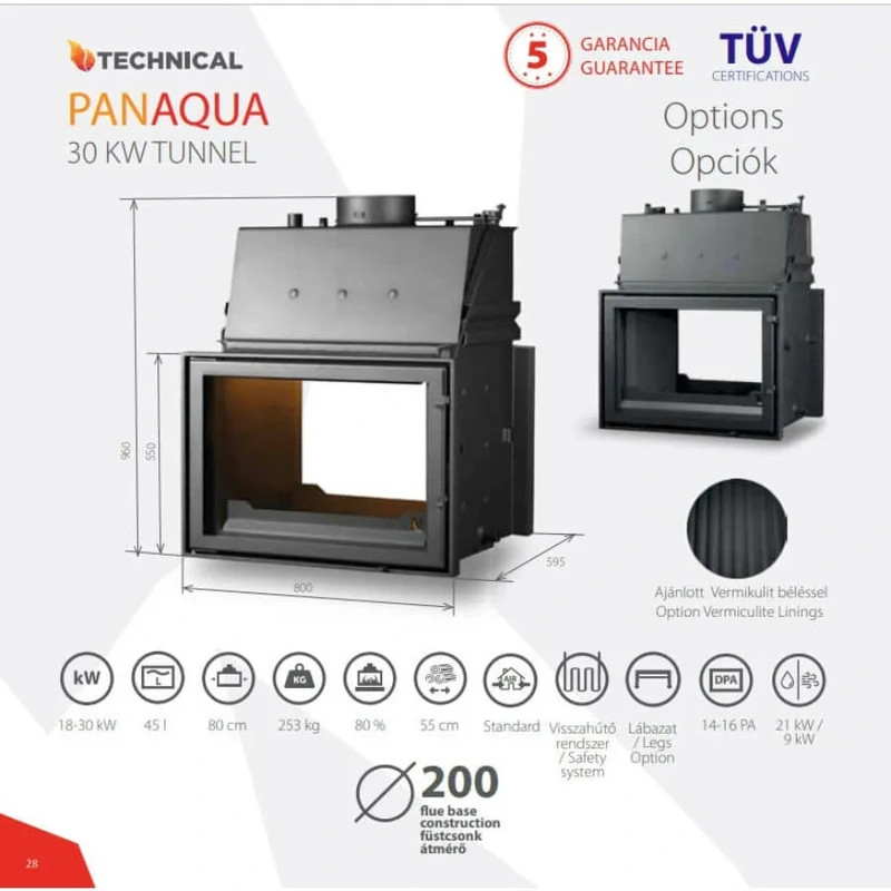 A PanAqua vízteres kandallóbetétek a Technical saját fejlesztésű és gyártású, az elérhető legmagasabb TÜV minősítéssel ellátott központi fűtésre köthető vízteres megoldások. A 30 kW-os Tunnel d200 modell hatásfoka meghaladja a 80%-ot, mely kiemelkedő teljesítmény a vízköpenyes betétek között. Ez a típus a tűztéren kívül egy hatékony hőcserélő rendszerrel is rendelkezik, amelyben a víz kering és a kandalló ennek a víznek adja át a hőt, ami aztán eljut a fűtőtestekhez. Radiátoros és padlófűtéses rendszerrel egyaránt használható, így új- és meglévő épületek fűtési rendszerébe is beépíthető.