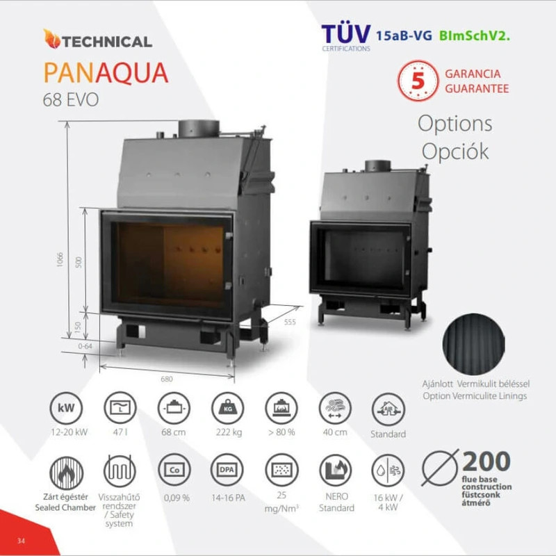 A PanAqua 68 EVO a Technical saját fejlesztésű, legmagasabb TÜV minősítésű vízteres kandallóbetétje, mely 80% feletti hatásfokkal rendelkezik. Zárt égésterű, központi fűtésre köthető megoldás, mely teljes értékű fűtési rendszerként szolgál akár az egész otthon számára.
