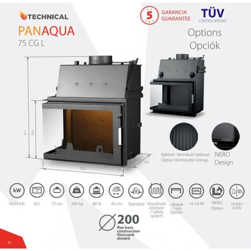 A PanAqua 75 CG Bal vízteres kandallóbetét a Technical hazai gyártású, kimagasló minőségű terméke, amely egyesíti a kandalló hangulatát a modern központi fűtési rendszerek hatékonyságával. A 14-24 kW teljesítményű betét 43 literes víztérfogatával és A energiaosztályával garantálja a költséghatékony üzemeltetést. A baloldali csatlakozású modell ideális választás új építésű és felújítandó ingatlanok számára egyaránt, ahol a vízteres fűtési rendszer kiépítése megoldható.