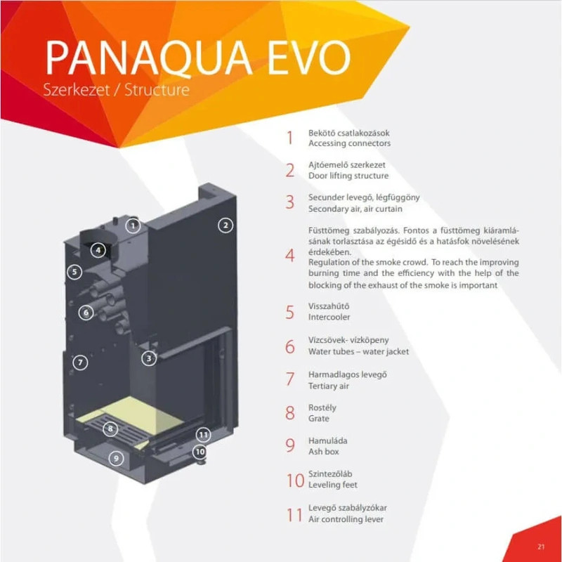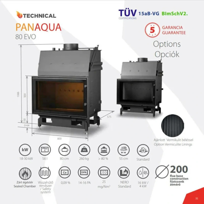 A Technical saját fejlesztésű PanAqua 80 EVO zárt égésterű, vízteres kandallóbetét több mint 80%-os hatásfokkal, TÜV minősítéssel. Teljes értékű fűtési megoldás radiátoros és padlófűtéses rendszerekhez, használati melegvíz termelésre is alkalmas.
