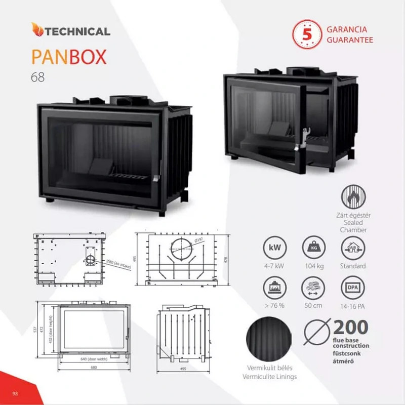 A PanBox 68 kandallóbetét a modern fűtéstechnika és az elegáns design tökéletes ötvözete. Az öntvény kandallóbetétekhez képest kompaktabb kialakítása kisebb teljesítmény leadása mellett is kiváló, 76% feletti hatásfokkal működik. A samott-vermikulit béléssel ellátott égéstér, a korszerű porleválasztó és lángterelő rendszer biztosítja a tiszta, hatékony égést. A diszkrét kezelőszervek és a maximális üvegfelület garantálják a látvány élményét, miközben A energiaosztályú minősítése környezetbarát használatot ígér.