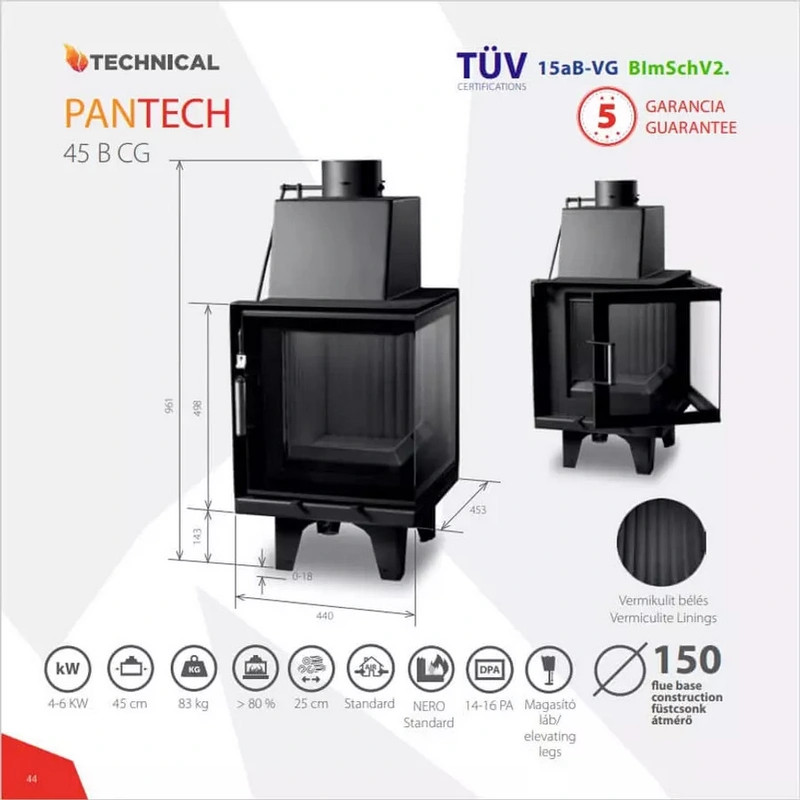 A PanTech 45 B CG d150 kandallóbetétre a gyártó 5 év garanciát vállal, amely a magas minőséget és a hosszú élettartamot garantálja. A garancia a gyártási hibákra és az anyaghibákra terjed ki, rendszerszerű használat mellett. A kandallóbetét 83 kg-os súlya miatt szakszerű szállítást és beemelést igényel. Szállítás előtt javasolt a beépítés helyének előkészítése, a füstcső és a burkolat megtervezése. A termék átvételekor ellenőrizze a csomagolást és a termék sértetlenségét. Telepítését kizárólag szakképzett kéményseprő vagy kandallóépítő végezheti el a vonatkozó előírások betartásával.