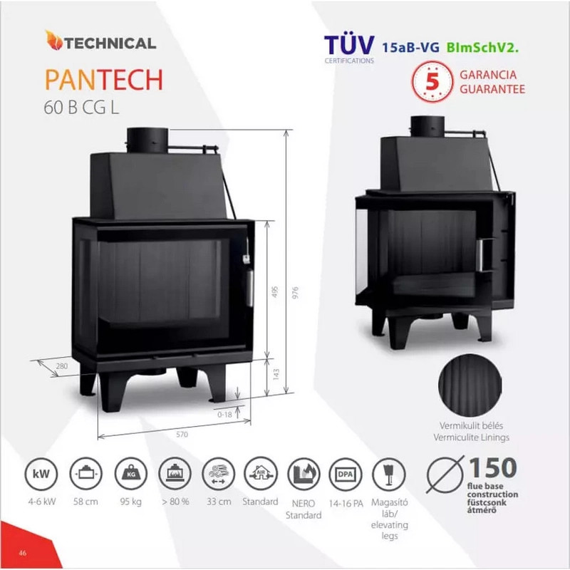 A PanTech 60 B CGL d150 kandallóbetét a Pantech B tűztércsalád prémium kategóriás tagja, amely az öntvény tűztereknél kisebb teljesítmény leadása mellett is kiváló hatásfokkal működik. A zárt égésterű kivitel külső levegő ellátású levegő előmelegítő rendszerrel van felszerelve, amely jelentősen javítja az égés hatékonyságát és csökkenti a fűtési költségeket. A 4-6 kW teljesítményű betét ideális választás közepes méretű helyiségek fűtésére, miközben A+ energiaosztályával megfelel a legkorszerűbb környezetvédelmi előírásoknak.