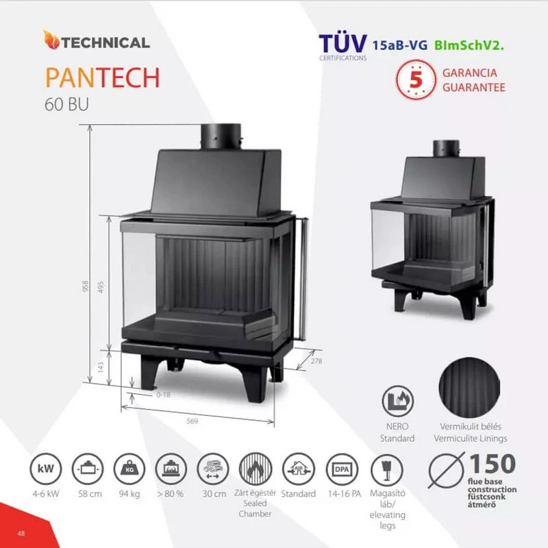 A PanTech 60 BU d150 kandallóbetét a legkorszerűbb fűtéstechnológiát képviseli. A porleválasztó rendszer csökkenti a füstgáz szennyezettségét, míg a lángterelő elemek biztosítják az optimális égést és a maximális hőátadást. A samott-vermikulit kombináció kiváló hőtároló képességgel rendelkezik, így az égés befejeztével is hosszasan sugároz kellemes meleget. A külső levegő ellátású rendszer különösen előnyös passzív házakban és jól szigetelt épületekben, ahol a belső levegő felhasználása nem kívánatos. A 150 mm-es füstcső csatlakozás szabványos méret, így könnyen illeszthető meglévő kéményrendszerhez is.