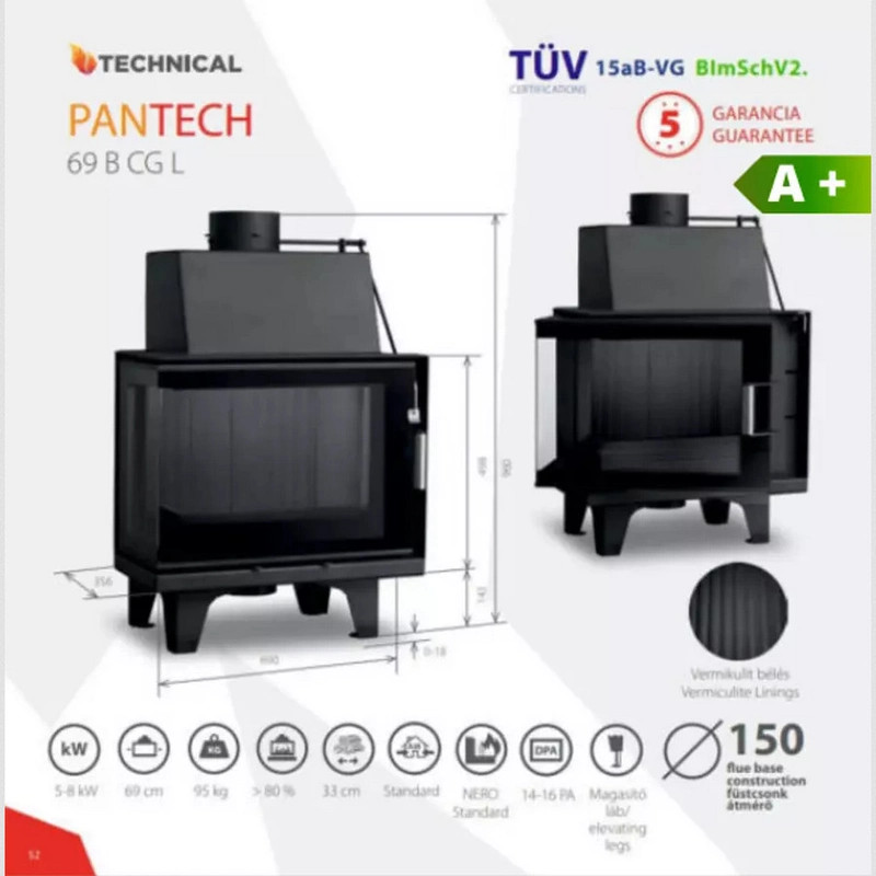 A PanTech 69 B CGL d150 kandallóbetét a legmodernebb fűtéstechnikai követelményeknek megfelelően készült. A 4 milliméteres falvastagság kiváló mechanikai szilárdságot biztosít, míg a samott-vermikulit bélés optimális hőtárolást és -leadást garantál. A speciális porleválasztó és lángterelő rendszer biztosítja a tiszta égést és a kimagasló hatásfokot. A külső levegő ellátású rendszer lehetővé teszi, hogy a kandallóbetét ne a fűtött helyiség levegőjét használja az égéshez, így nem csökkenti a lakótér oxigénszintjét. A 150 mm-es füstcsonk átmérő megfelelő huzatot biztosít, az öntvény füstcsappantyú pedig megakadályozza a visszacsapódást. A 69 cm széles, panoráma jellegű üvegfelület páratlan élményt nyújt a tűz szemléléséhez, miközben a kezelőszervek diszkréten elhelyezve nem zavarják a látványt.