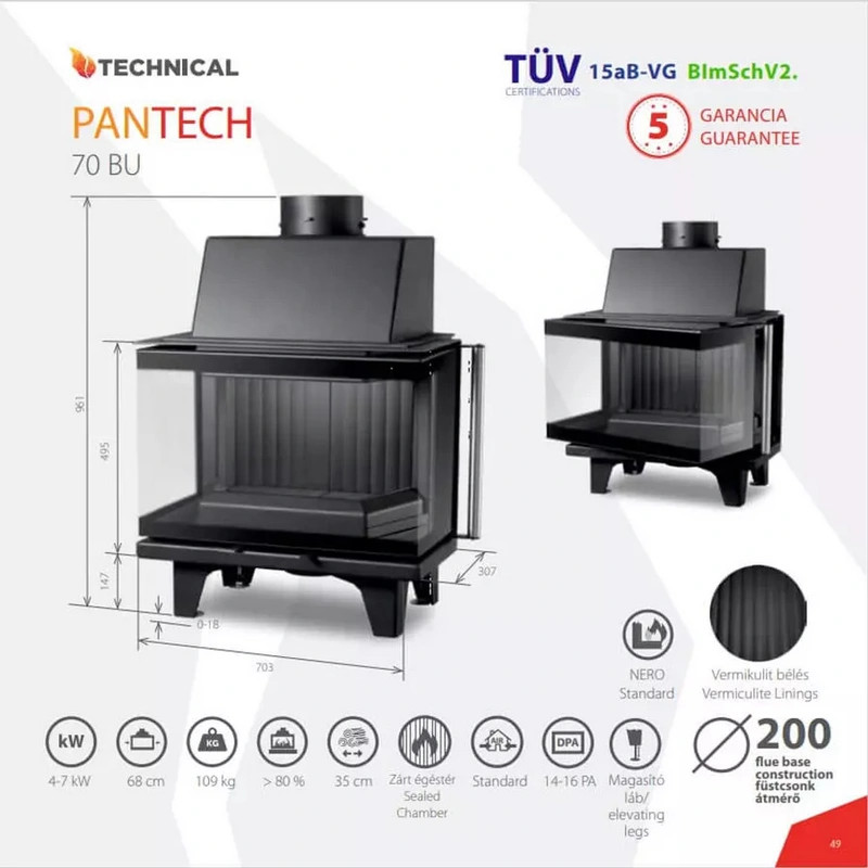 A Pantech B tűztércsalád az öntvény tűztereknél kisebb teljesítmény leadása mellett is kiváló hatásfokkal tud működni. A PanTech 70 BU kandallóbetét zárt égésterű kivitelben készült, külső levegő ellátású levegő előmelegítő rendszerrel felszerelve. Ez a tűztér már a jövő elvárásainak megfelelő technológia fejlesztéssel készült, magas szintű, hosszú fejlesztő mérnöki munka eredménye. Az A+ energiaosztályú berendezés környezetbarát és gazdaságos üzemeltetést biztosít.