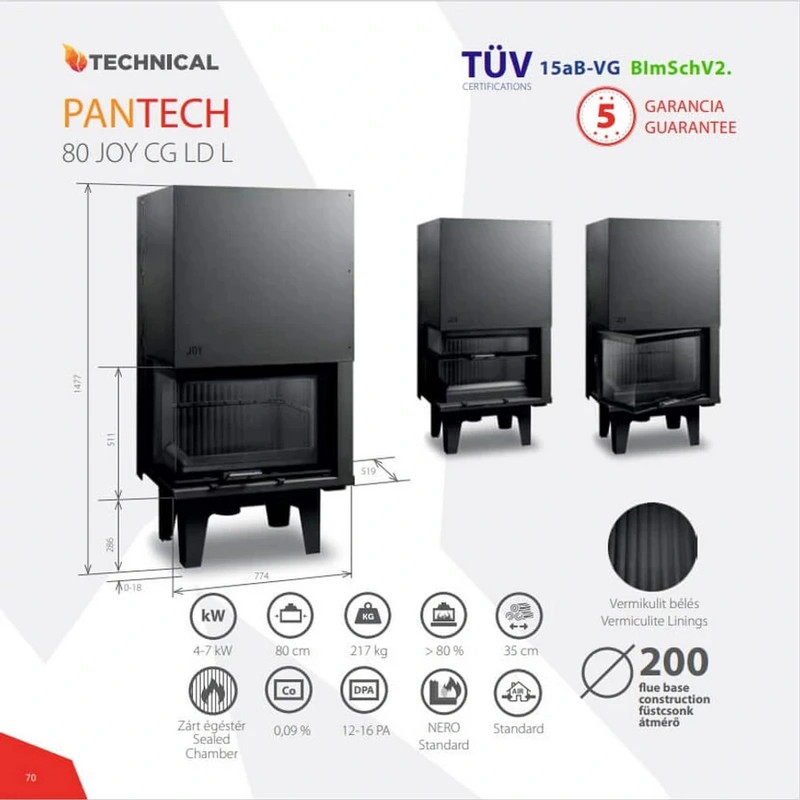 A PanTech 80 JOY CG LD L d200 kandallóbetétre 5 év gyártói garancia vonatkozik, amely a kiváló minőséget és a gyártó elkötelezettségét bizonyítja. A készülék gondos csomagolásban, raklap-szállítással érkezik. A 217 kg súly miatt javasolt előre egyeztetni a szállítás és beépítés körülményeit. A telepítést mindenképpen szakképzett szerelővel végeztesse, aki biztosítja a tűzvédelmi előírásoknak való megfelelést és a készülék optimális működését. A garancia a szakszerű beszerelés és rendeltetésszerű használat esetén érvényes.