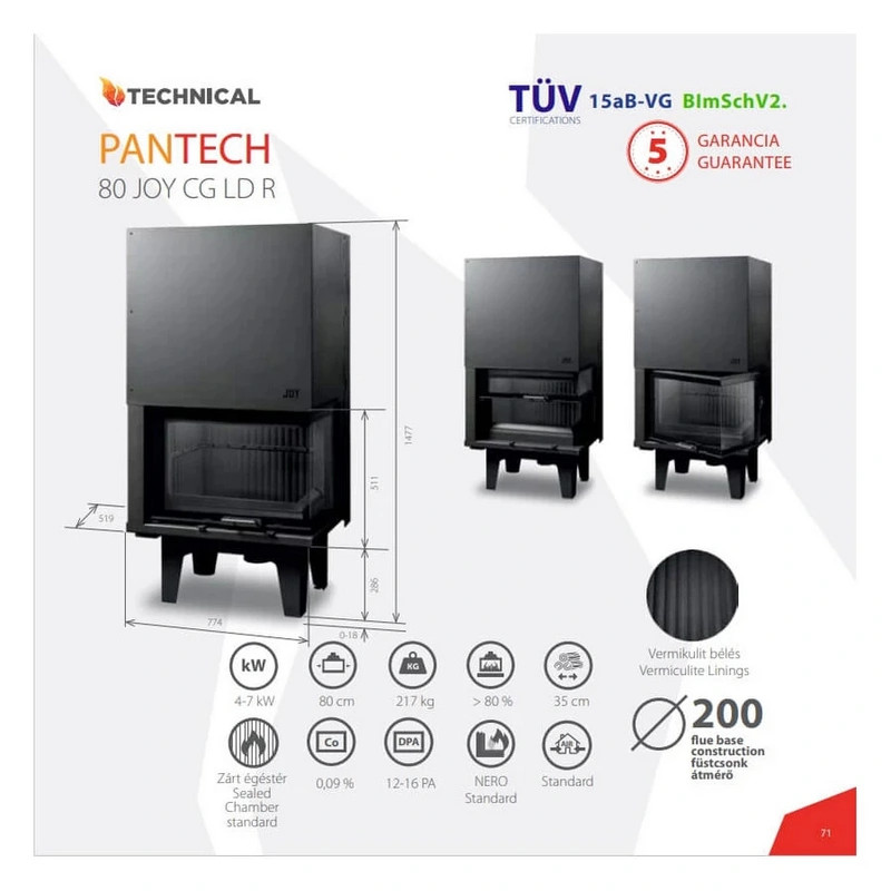 A Pantech JOY sorozat legmodernebb tagja, liftes ajtóval és NERO üvegezéssel. Kiváló 80% feletti hatásfokkal, A+ energiaosztályú, zárt égésterű kandallóbetét, amely rossz huzatviszonyok mellett is kifogástalanul működik.