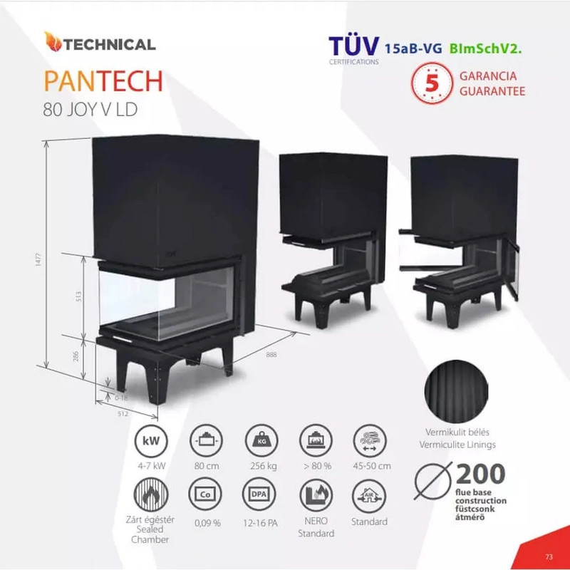 A PanTech 80 JOY V LD kandallóbetét zárt égésterű konstrukciója és korszerű utánégető rendszere biztosítja a tiszta, környezetbarát égést. A liftes ajtó nemcsak elegáns külsőt kölcsönöz a készüléknek, hanem gyakorlati előnyökkel is rendelkezik: megakadályozza a füst bejutását a helyiségbe még gyenge kéményhuzat esetén is. A NERO üvegezési rendszer maximalizálja az üvegfelületet, így a lángok látványa teljes pompájában élvezhető. A 256 kg-os masszív konstrukció stabilitást és tartósságot garantál, míg a kompakt 52 cm szélesség és 148 cm magasság miatt könnyen beépíthető különböző helyiségekbe. A 89 cm-es mélység elegendő teret biztosít az optimális égéshez szükséges légáramlásnak.