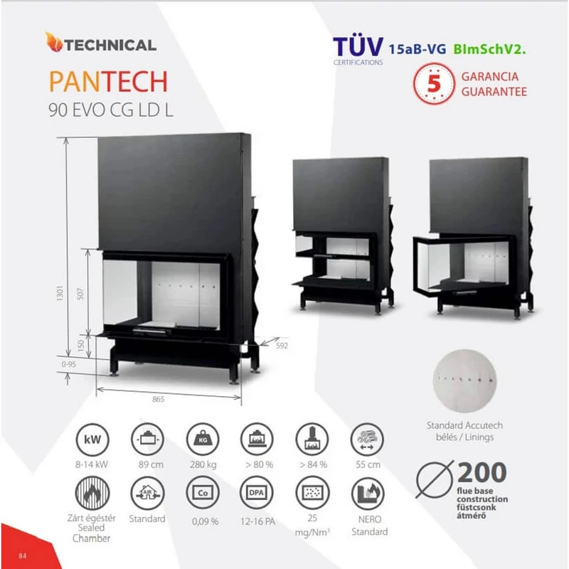 A PanTech 90 EVO CGL LD d200 kandallóbetét a Technical legújabb generációs fejlesztésének eredménye, amely ötvözi a modern dizájnt a legkorszerűbb fűtéstechnológiával. Az EVO sorozat alapvetően külső levegő csatlakozóval rendelkezik, hermetikusan zárt az élettér felé, így nem vesz el oxigént a lakótérből. A tűztér modern, minimalista stílusú megjelenését a különleges Nero üvegezés adja, amely nem csak esztétikus, de fokozza a lángok látványát is. Az evolúciós levegőellátó rendszer képes akár 10 órás folyamatos égési időt biztosítani egyetlen tűzifatöltéssel, miközben a hatásfok meghaladja a 80%-ot. A készülék a legmagasabb TÜV minősítéssel és A+ energiaosztállyal büszkélkedhet.