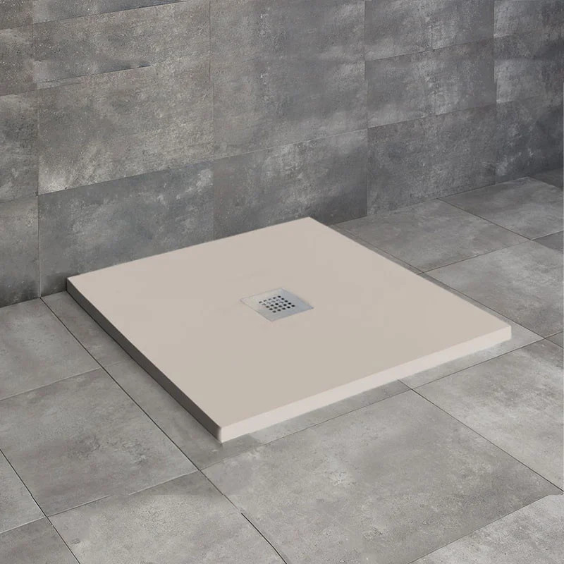 Kiállítási darab! Modern, szögletes műmárvány zuhanytálca 90x90 cm méretben, amely közvetlenül a padlósíkra építhető. Matt bézs felületű, elegáns és tartós megoldás.