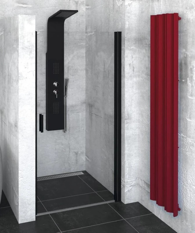 Elegáns nyíló zuhanyajtó 900 mm szélességgel, amely két fal közé beépíthető vagy oldalfallal kombinálható. Transzparent üveggel, fekete matt profillal és Antidrop felületkezeléssel rendelkezik.