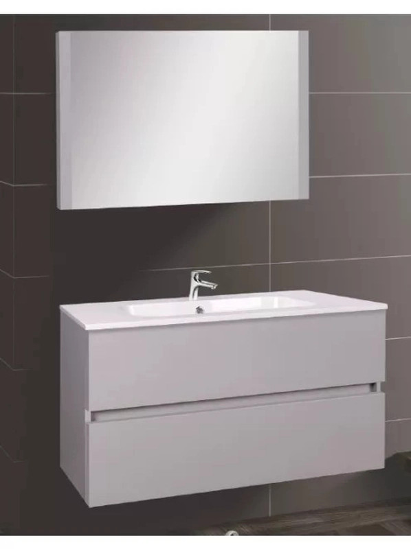 Elegáns, szürke színű fali mosdószekrény két praktikus fiókkal. Modern dizájn és megbízható tárolás a fürdőszobában.