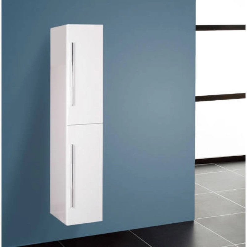 Elegáns, fehér függesztett magas szekrény a fürdőszobához. Kompakt 35 cm széles kivitelben, 140 cm magas, fali rögzítéssel. Praktikus tárolás modern designban.