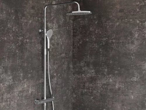 A RAVAK DS sorozatból származó állítható zuhanyoszlop elegáns fényes króm kialakítással. Komplett zuhanyszettel felszerelt, modern fürdőszobák ideális kiegészítője.