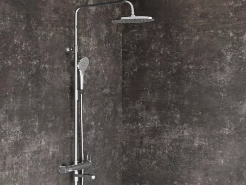 A RAVAK DS sorozat prémium minőségű zuhanyoszlopa teljes zuhanyszettel, fényes króm kivitelben. Állítható magasság és ergonomikus kialakítás az ideális zuhanyélményért.