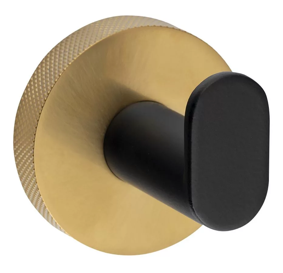 Elegáns fürdőszobai fogas matt fekete és arany kivitelben. Kompakt méretei ideálisak a szűkös helyekre, praktikus és stílusos megoldás minden fürdőszobához.