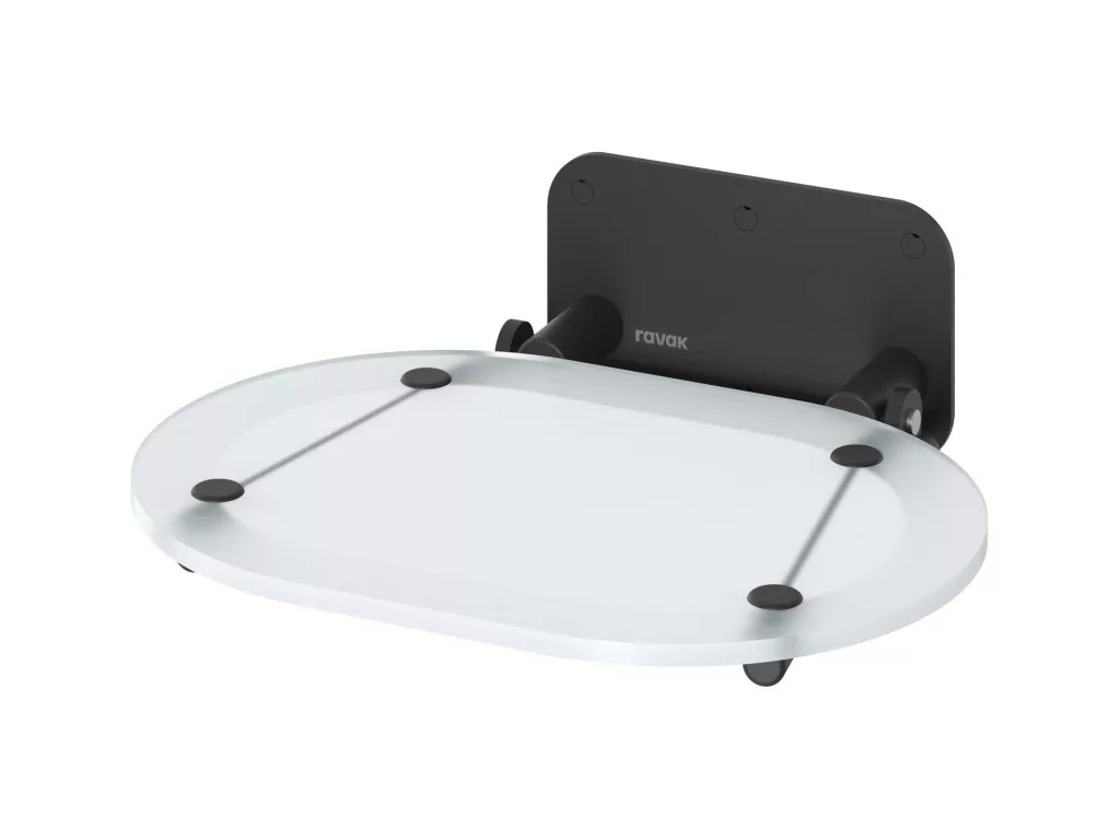 RAVAK Chrome összecsukható zuhanyülés modern dizájnnal és praktikus tárolhatósággal. Fekete konstrukció átlátszó ülőkével, ovális forma, fürdőszobai használatra tökéletes.