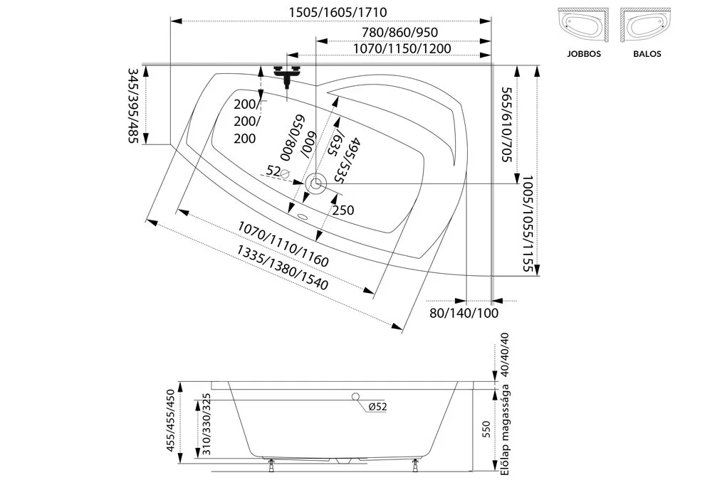 Claudia aszimmetrikus akril kád 160x105 jobbos