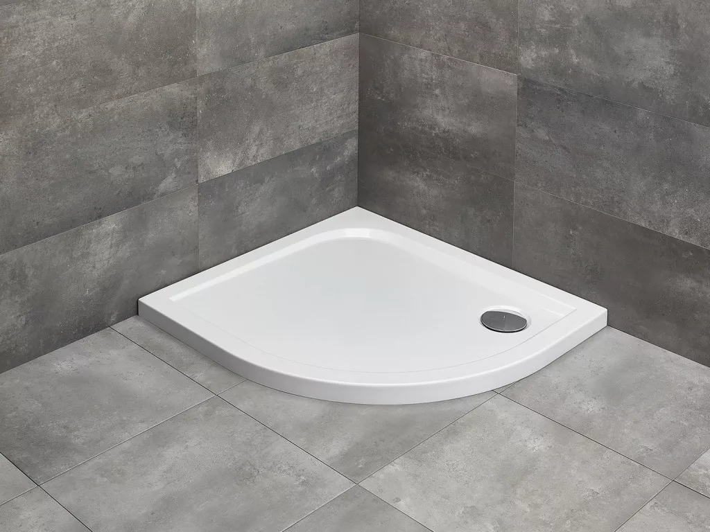 Modern íves aszimmetrikus zuhanytálca 100x80 cm-es méretben. Radaway Delos E sorozat, fehér színben, komplett szifonnal szállítva, könnyen telepíthető vízszintes burkolatra.