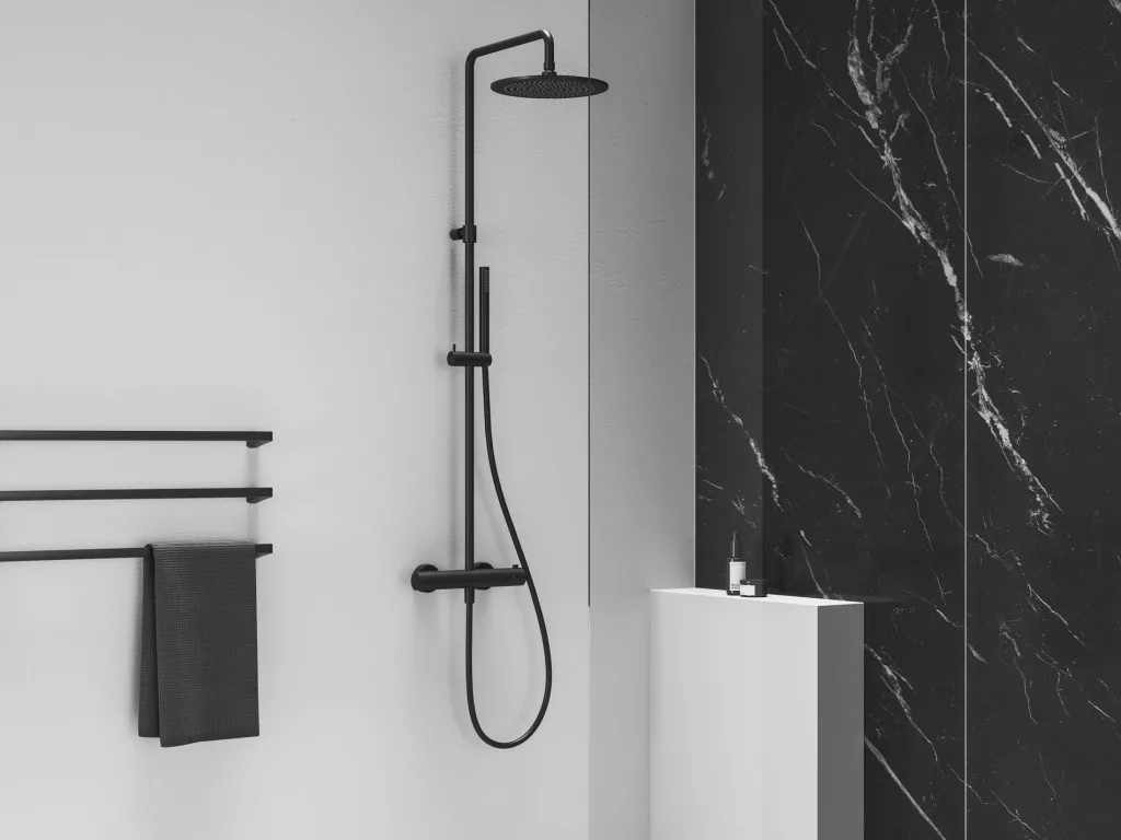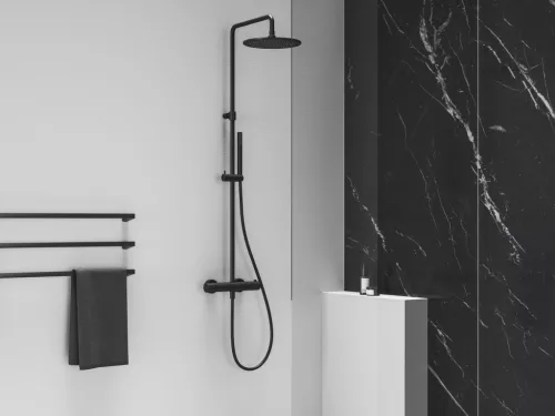 Modern, termosztátikus vezérléssel ellátott zuhanyoszlop csúszó csatlakozással. Elegáns Black Matt kialakítás, amely tökéletesen illeszkedik a kortárs fürdőszobákba.
