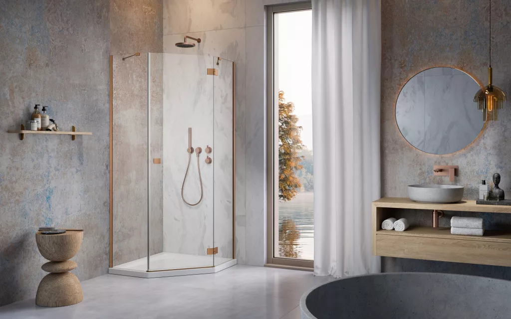 Modern, letisztult dizájnú ötszögletű zuhanykabin szálcsiszolt réz profilokkal. 6 mm vastag edzett üveggel, Easy Clean bevonattal, amely hatékonyan elhárítja a vízkőfoltokat és lerakódásokat.