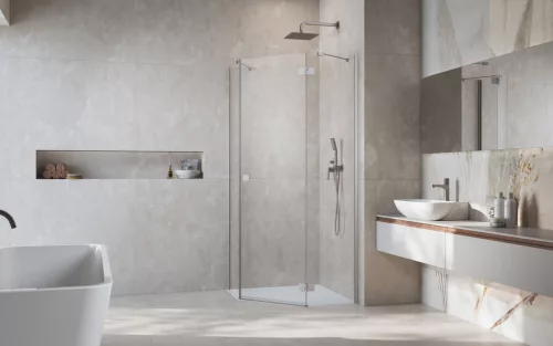 • Átlátszó üveg megoldás: Az átlátszó üveg vizuálisan tágítja a teret, míg a nagyfokú fényelvezetés miatt világosabb és kellemesebb fürdőszoba-légkört hoz létre.
