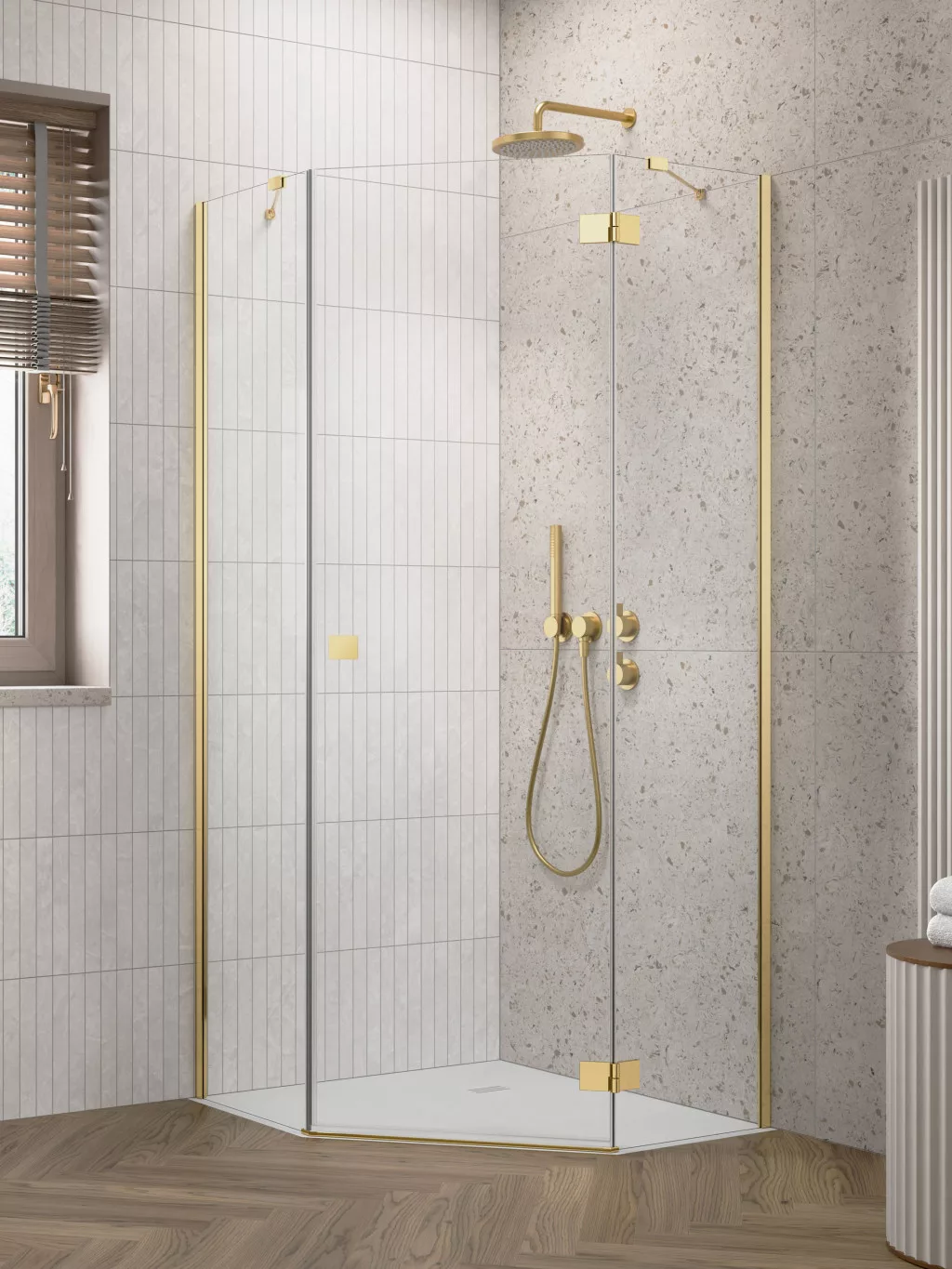 Az Essenza Gold PTJ egy prémium minőségű szögletes ötszögletű zuhanykabin, amely a Radaway márkától származik. Letisztult, modern dizájnjával tökéletes kiegészítője az igényes, kortárs fürdőszobák felújításának. A zuhanykabin méretei: 90 cm szélesség és 100 cm mélység, 200 cm magassággal, mely biztosítja a kényelmes, nyújtózkodás nélküli használatot. Az arany profilozás elegáns kontrasztot nyújt az átlátszó üvegezéshez.