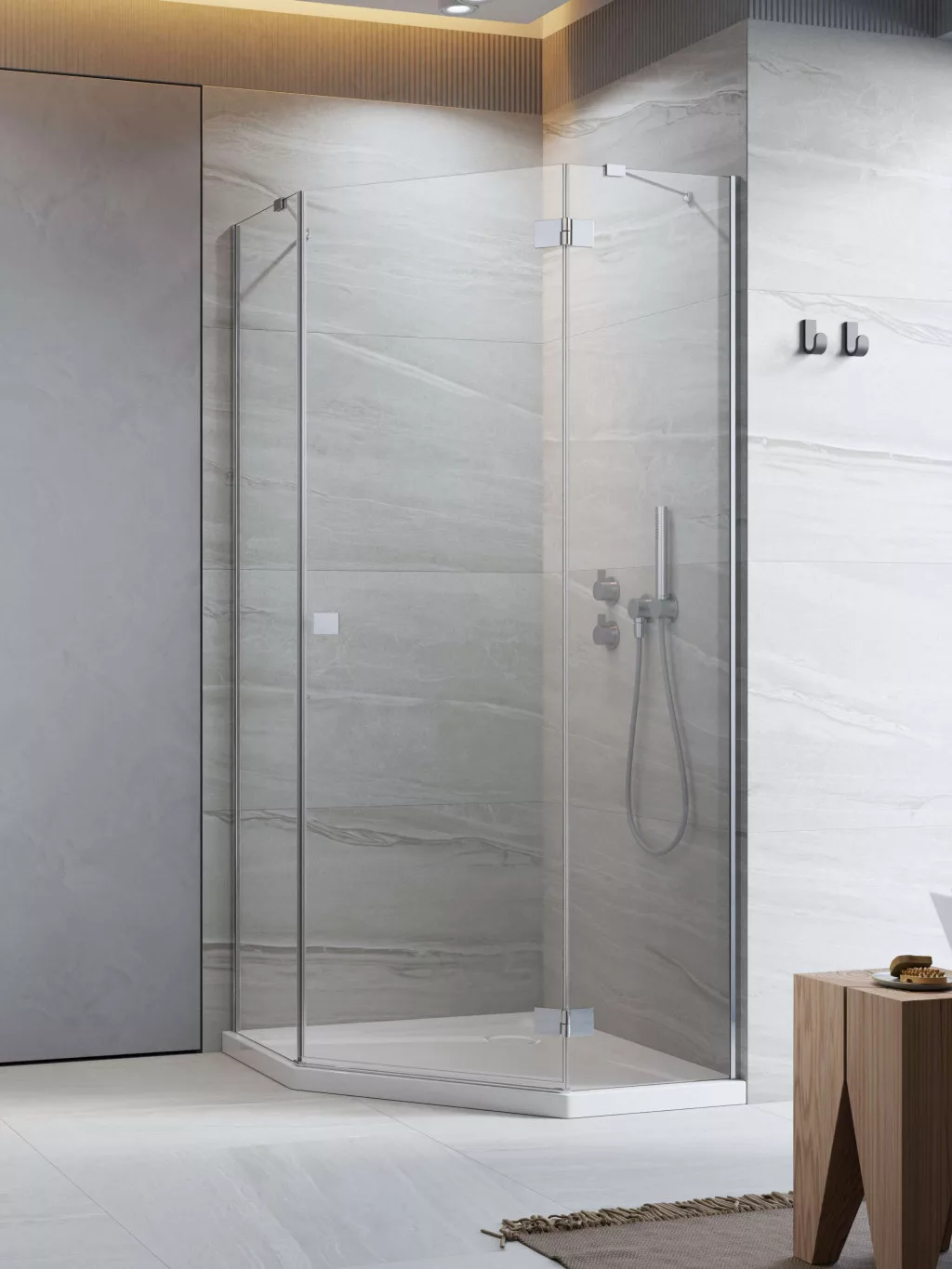 Modern, letisztult designú ötszögletű zuhanykabin 6 mm vastag edzett üveggel és Easy Clean bevonattal. Könnyű tisztántartás és tökéletes vízzárás a mechanikus ajtóemelő zsanérnak köszönhetően.