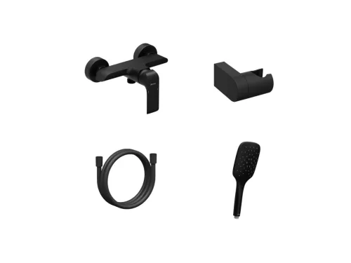 Elegáns falra szerelhető zuhanycsaptelep RAVAK Flat sorozatból, matt fekete kivitelben. Komplett zuhanyszettel, modern design és megbízható teljesítmény.