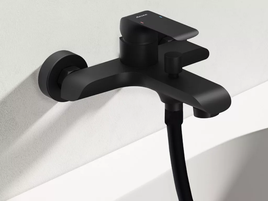 Elegáns fali kádcsaptelep matt fekete kivitelben a RAVAK Flat sorozatból. Modern design és megbízható teljesítmény minden fürdőszobához.