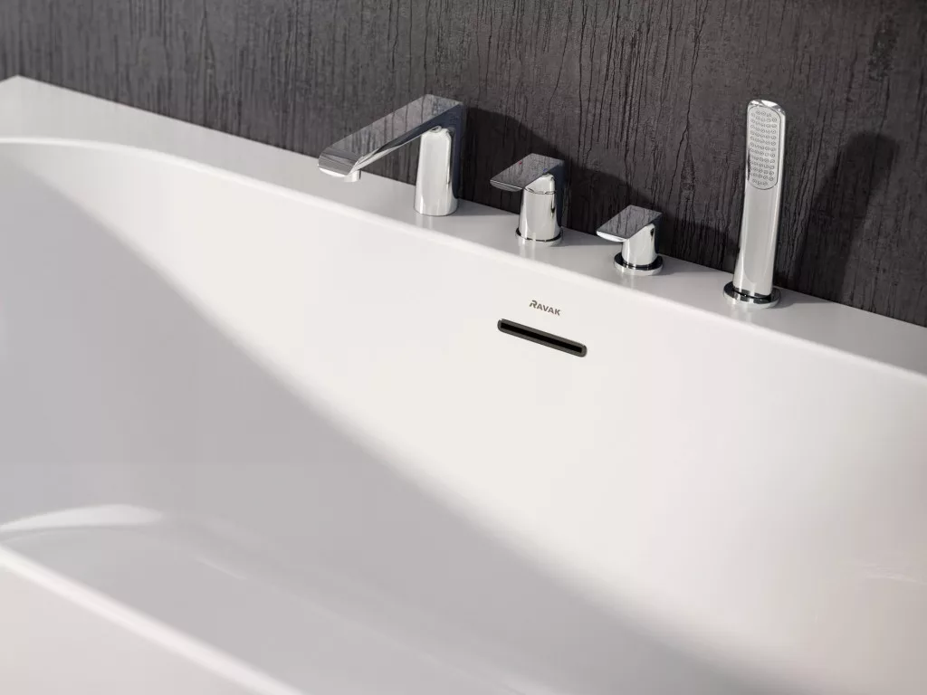 A RAVAK Flat sorozat négylyukú kádperem csaptelep elegáns króm kivitelben. Zuhanykészlettel felszerelt, könnyen szerelhető megoldás modern fürdőszobákba.