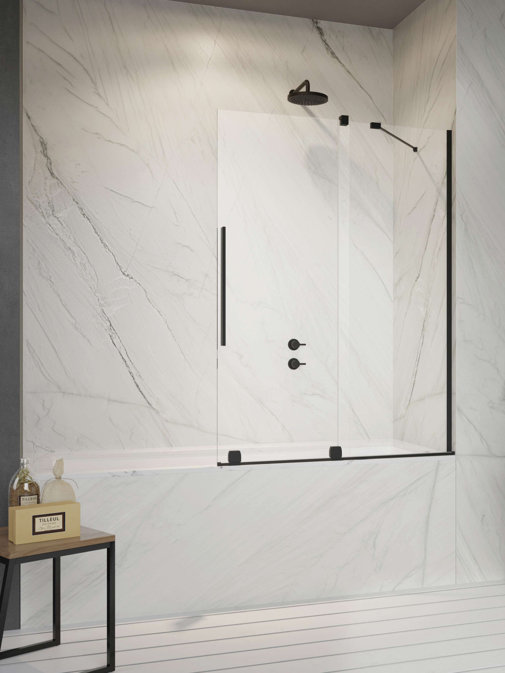 Elegáns fekete kádparaván 100 cm széles, 150 cm magas méretekben. 8 mm vastag edzett üveggel, Easy Clean bevonattal és innovatív zökkenőmentes görgőrendszerrel. Modern fürdőszobák ideális választása.