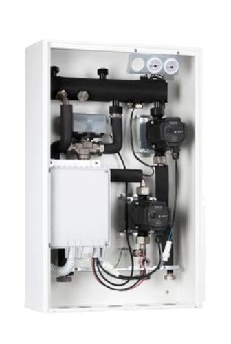 Kompakt, falra szerelhető hidraulikus modul két különálló fűtési zóna vezérlésére: egy kevert és egy direkt körrel, integrált időjárásfüggő szabályozással és energiatakarékos szivattyúkkal.