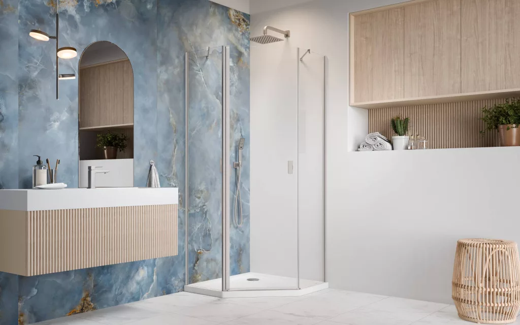 A termék szögletes, ötszögletű kialakítása maximális belső térfogatot biztosít, míg az intelligens nyitásmechanika a legszorosabb fürdőszobákban is szabadságot ad az ajtó mozgatásához.