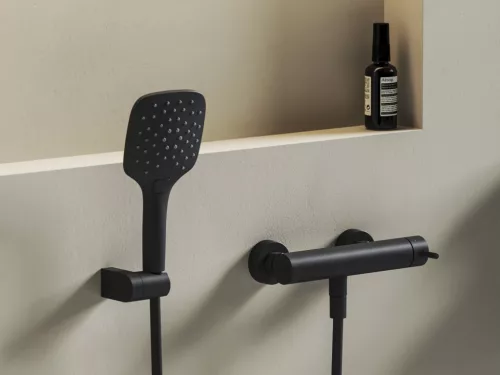 A csaptelep szett nélküli kivitelben érkezik, amely azt jelenti, hogy bármilyen szabványos zuhanykészlettel kombinálható. A csatlakozási pontok universális standard méretűek, így széles választékból választhat. Javasolt azonban olyan zuhanykészletet választani, amely méretben és stílusban harmonizál a matt fekete csaptelepi kivitelrel. Forduljon szállítójához a kompatibilitás biztosításáért.