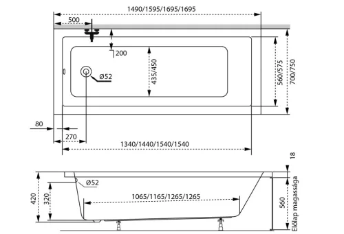 • Méret: 150 x 70 cm – ideális nagyságú, általános fürdőszobákhoz