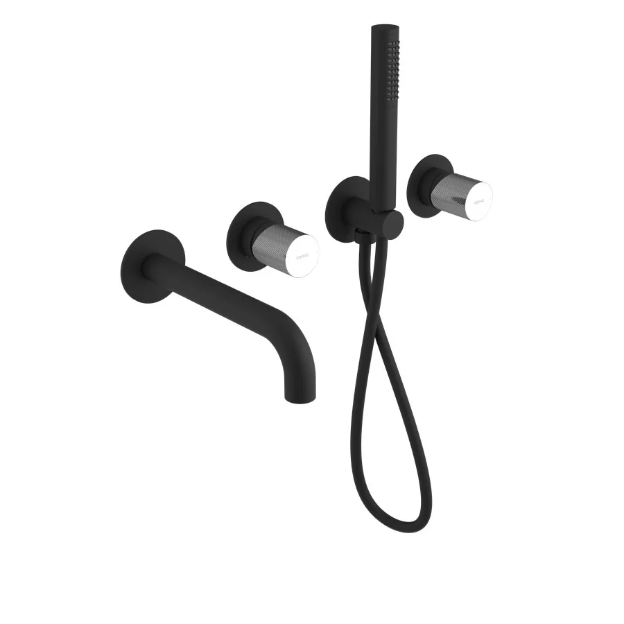 Elegáns falba építhető fürdőszobai csaptelep kézizuhannyal és kifolyócsővel. Matt fekete és króm dizájn, 2-irányú működés, 6 év garanciával.